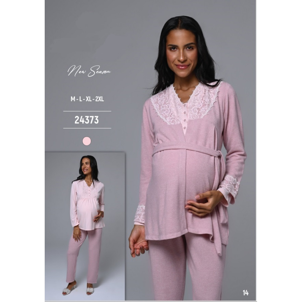 طقم حمل مريح وناعم للأم: بلوزة فضفاضة على البطن بقصة مريحة وأزرار أمامية (بتسهل الرضاعة بعد الولادة)، مع روب خميل دافئ بحزام خصر، وتفاصيل دانتيل أنثوية على القبة. بيناسب أول أيام النفاس واستقبال الضيوف.