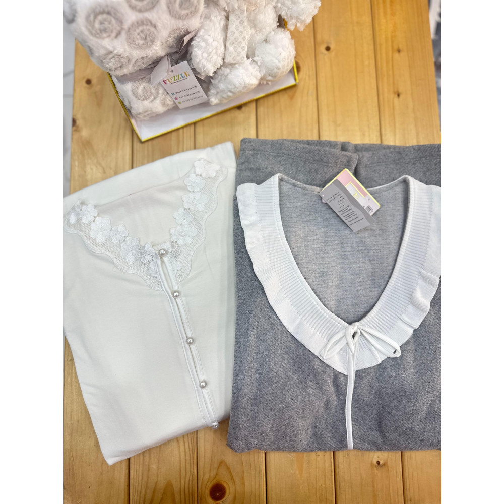 يجامة نفاس بزرار مع روب رمادي دافئ بتفاصيل ناعمة حوالين الرقبة