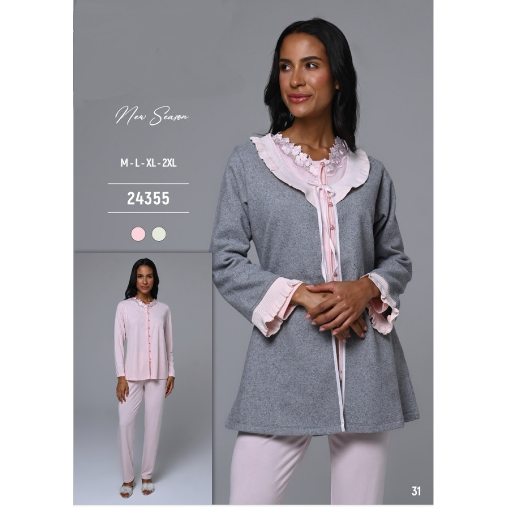 ومعاهم روب رمادي دافئ من الخارج وتفاصيل ناعمة حوالين الرقبة والأكمام بلون زهري او الابيض. الطقم مناسب لأول أيام النفاس